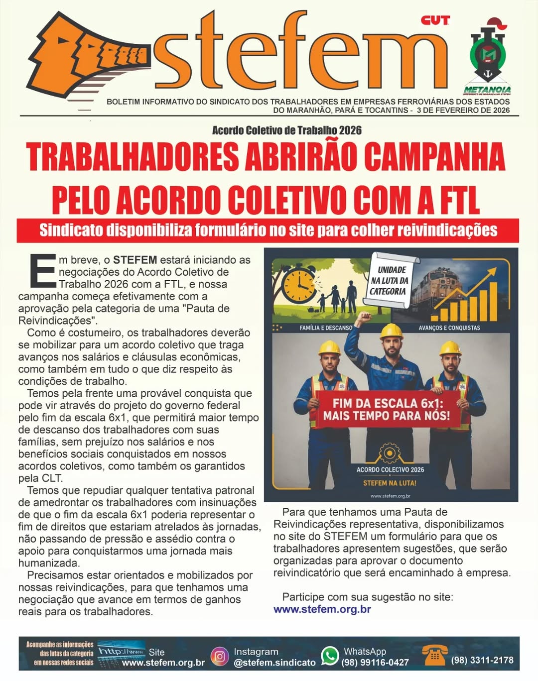O STEFEM convoca todos os trabalhadores na Ferrovia de Integração Centro Oeste – FICO – para participarem de ASSEMBLEIA GERAL online, no próximo dia 24 de novembro, para decidirem pelo «voto eletrônico» sobre a proposta da Vale para o Acordo Coletivo de Trabalho 2025/2026.Os trabalhadores poderão acessar a página para a votação online no site…