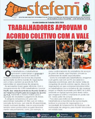 Os trabalhadores e trabalhadoras aprovaram e autorizaram o STEFEM à assinatura do Acordo Coletivo de Trabalho 2025/2026 nos termos da proposta apresentada na última reunião de negociações com a Vale e também ao acordo de PLR, submetidas em assembleias da categoria. As aprovações foram quase idênticas. Com o comparecimento de 3.363 trabalhadores, tivemos 94,5%…
